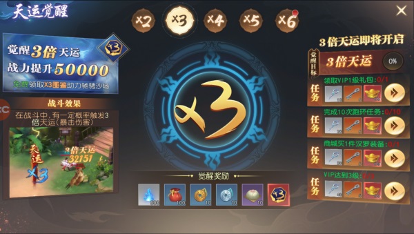X3:在战斗过程中有一定几率触发3倍天运(暴击伤害)