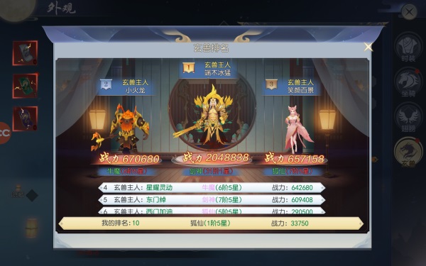 玄兽排行榜可查看当前其他玩家玄兽升阶情况。