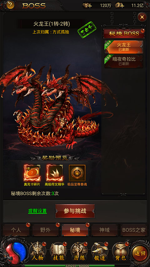 达到对应等级可解锁挑战野外BOSS,野外BOSS有几率掉落红装和红装碎片,参与挑战野外BOSS可以获得精炼石和金币奖励,挑战次数每2小时恢复1点,最多存储12点。