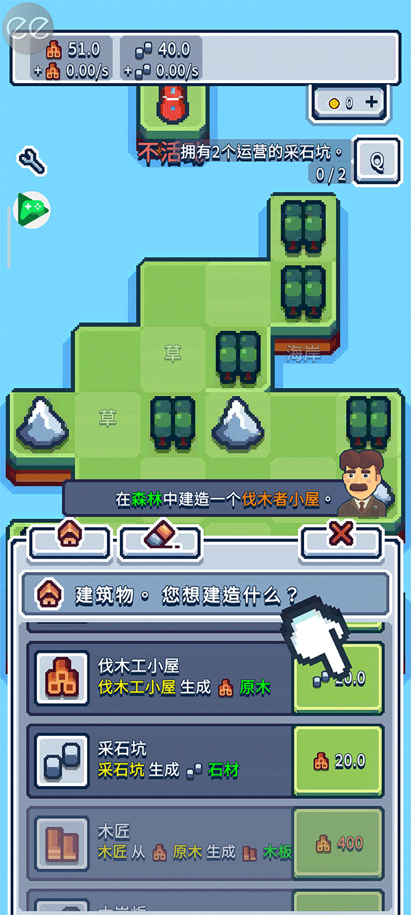 5、点击房屋标志,即可打开建造列表。在列表里找到伐木工小屋并点击即可