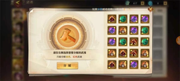 3、除了红魂,其他武魂都没有什么意义,金魂特定部位可以给主力英雄套装属性过渡,其他都直接分解,10个换个红魂。公会有个V12让我帮忙把号调一下,我上去首先分解了没有用处的52个金魂...增加5个红魂,一队实力大增。