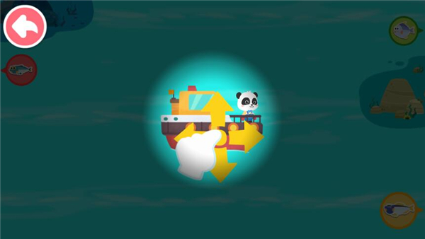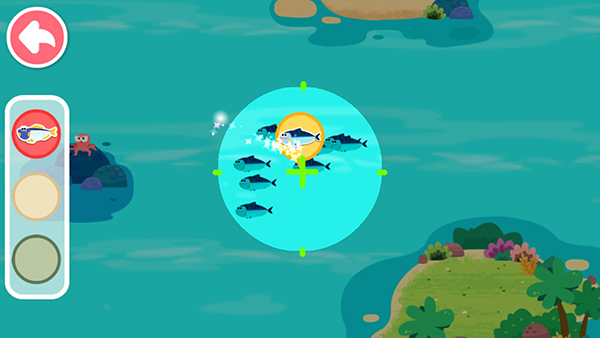 换上潜水服,去海底捕鱼喽。瞄准游动的鱼儿,发射鱼叉,抓住小鱼。小心!大鲨鱼来了!宝宝要迅速反应,立即往反向游动,躲避大鲨鱼!