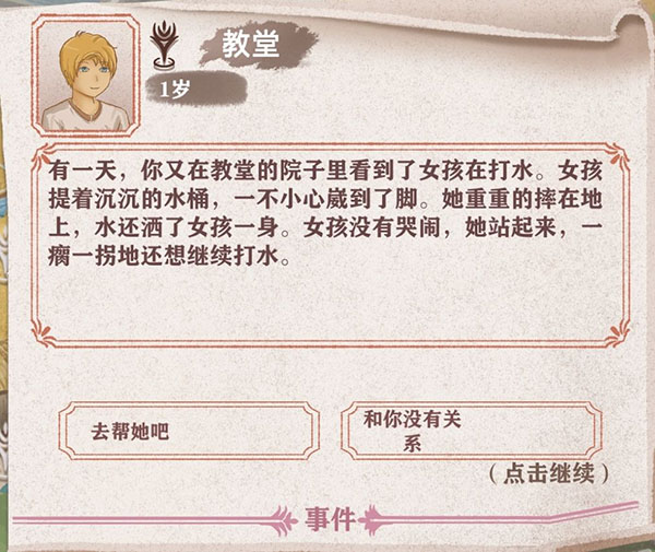 游戏整体采用了随机事件+剧情线的事件系统,简单来说,就是我们在角色年幼时期做出的事件的选择,可能会影响几十年后的剧情走向。