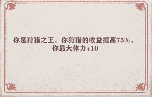 在低光环的情况下,属性不足,打工收益较低。狩猎之王可以在前期快速获得金钱,购买需要的物品。