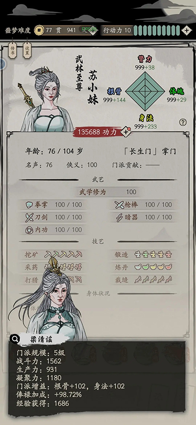 ♦本人76岁门派5级,全技艺全精通1.35万战力图: