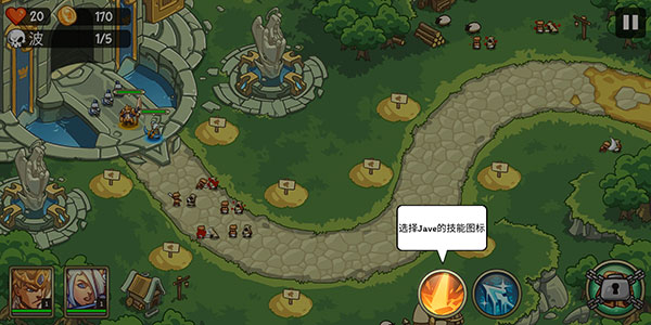 在进入战斗时我们三位英雄边上的土包就是我们需要建造防御塔的地方了,只需要点击土包然后选择防御塔的类型点击对号就可以创建成功,如果金币足够多的话是可以升级你的防御塔的等级越高攻击伤害越大。如果金币不多的话那么优先升级在路口前端最先和敌人战斗的防御塔。