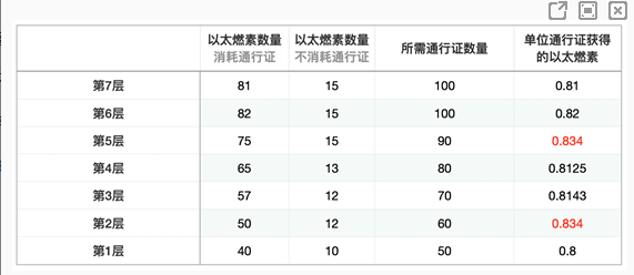 以太燃素的最快获取方式自然是分解掉落的材料了,其中G1、G2、G3、G4材料分别可以兑换1、2、3、4个以太燃素。而不同的关卡所需的时序通行证与能获得的燃素数量如下表所示,因此可以得出结论,在消耗同等时序通行证的情况下,打第2层和第5层能获得的以太燃素最多,而且难度也比较低,而不使用时序通行证则是第7层、第6层、第5层。