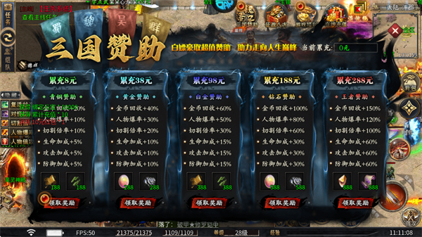 累计充值8元、38元等不同档位,能解锁青铜、黄金等赞助,大幅提升金币回收比例、人物爆率、切割倍率等核心属性。