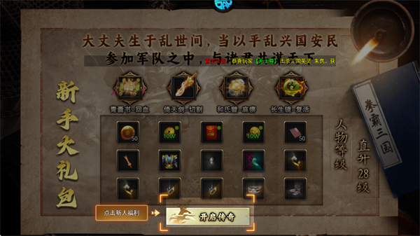 领取新手大礼包,可获得青蒿书(回血)、倚天剑(切割)等实用道具,开启传奇冒险。