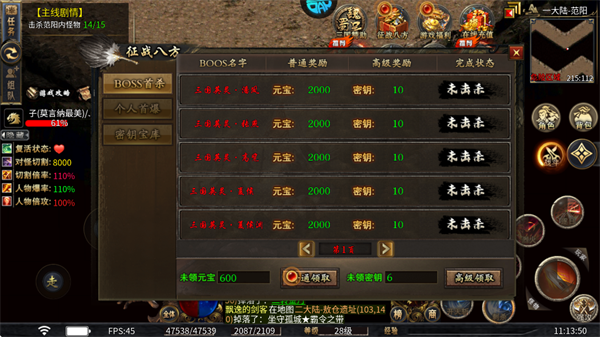 参与BOSS首杀活动挑战成功击杀可获得元宝、密钥等奖励,积累后可统一领取。