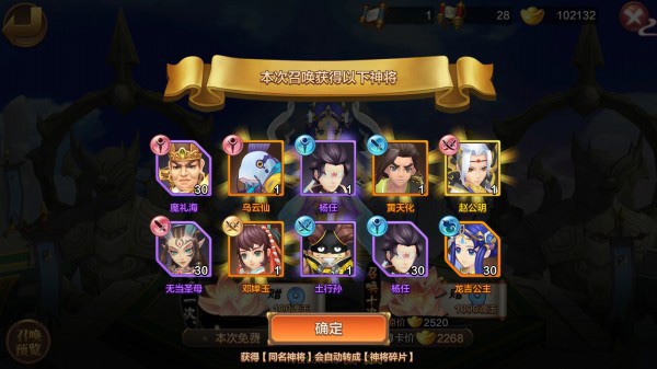 3、神将召唤:通过主界面“召唤”入口,可使用御灵符、御神符或元宝进行神将招募。不同召唤方式对应不同资源,左下角可查看可召唤神将列表。30级或VIP3后可解锁更多神将。