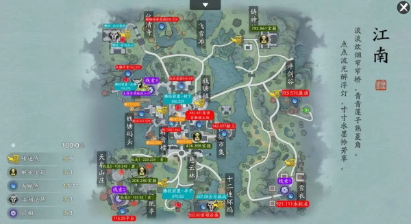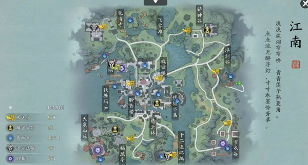 例如我们进入江南探索地图后,任务栏会出现“雾中寻月-寻找散落月相”的任务,这个就是我们的主线任务。小编建议顺序是:先完成探索主线,激活所有传送点,再进行解密宝箱、天赋点、江湖试炼等探索进度玩法。