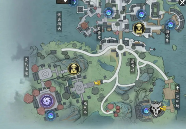 最后一个线索在天泉山庄最大的平台处,同样没有前置任务,少侠直接开启机关,击败小怪即可完成。