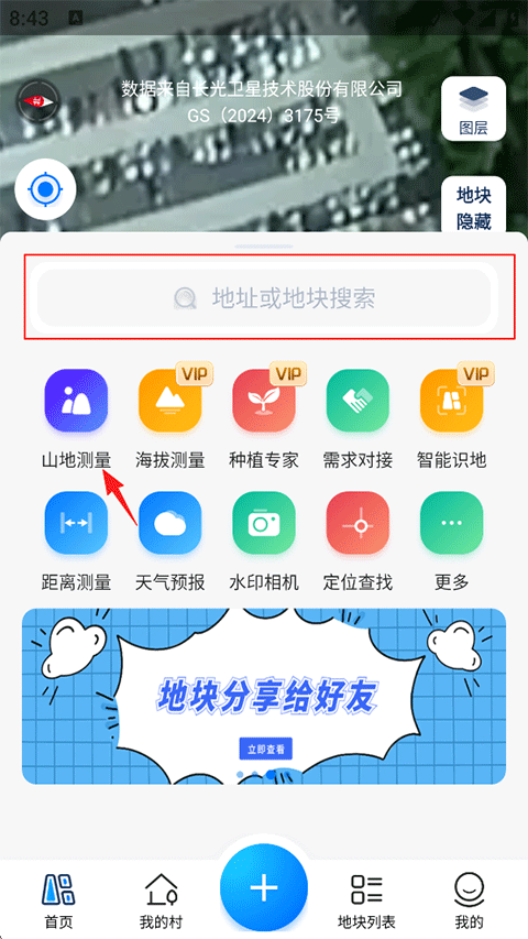 1、打开测亩宝APP,在搜索栏搜索地址,或点击下方的山地测量进入。