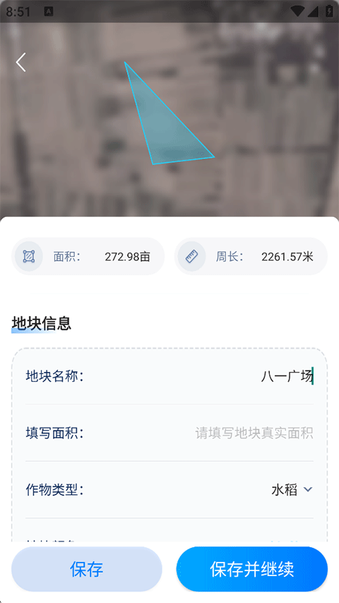 8、测量的结果如下,输入地块名称、选填地块真实面积、作物类型等,完成后点击保存。