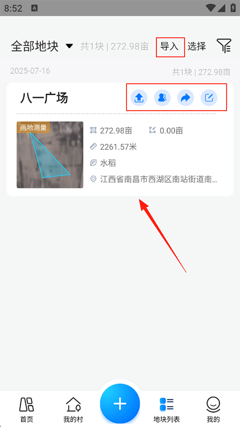 9、保存的地块可以在下方的地块列表页面中查看,还支持导入导出、分享共享及编辑地块功能。
