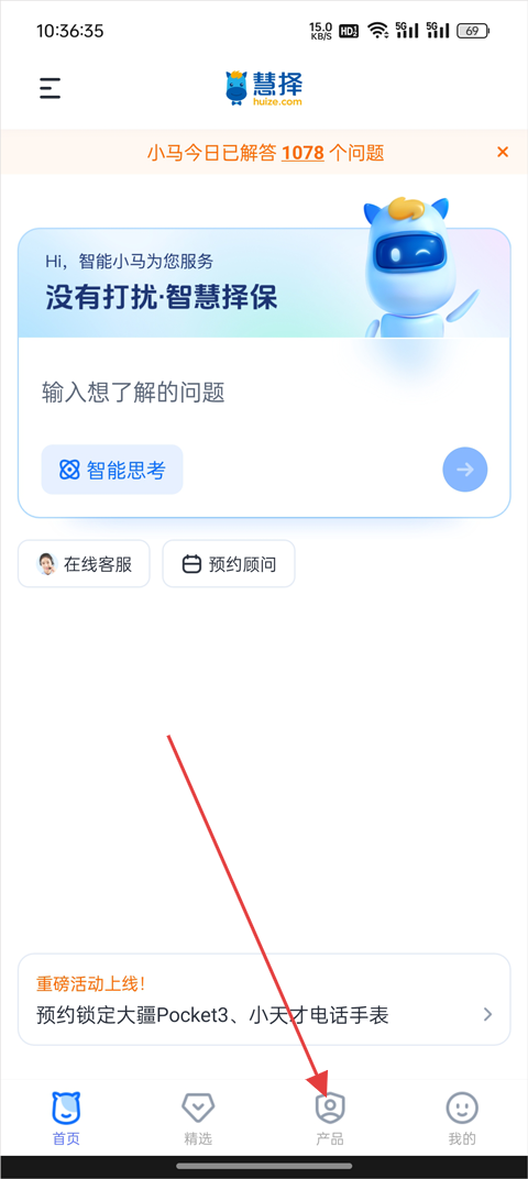 1、打开慧择保险网App,在首页底部菜单中点击【产品】;