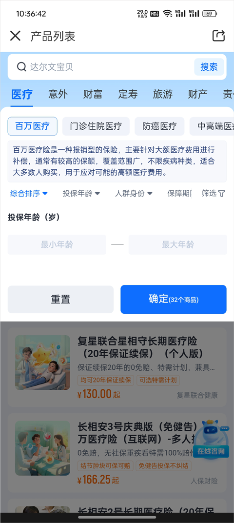 4、系统会根据填写的信息,智能推荐几款适合儿童的优质医疗险产品,你可以结合需求进行挑选;